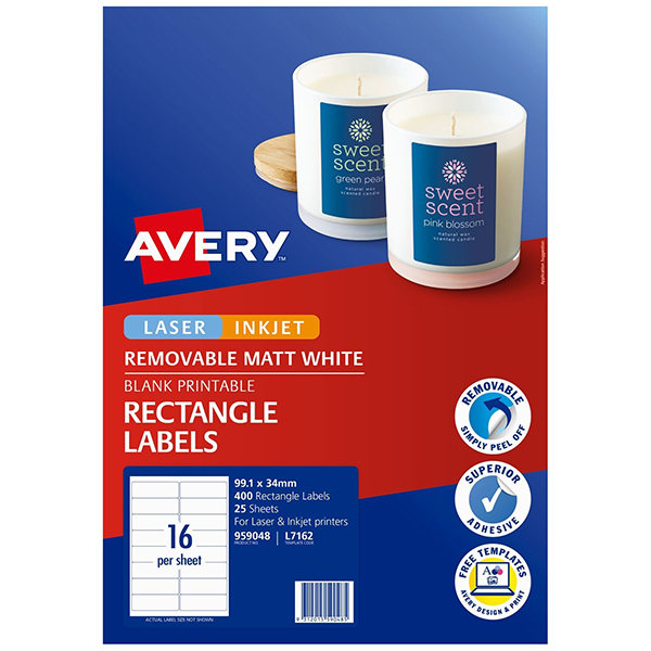 AVERY 959048 L7162 REMOVABLE LABEL LASER INKJET 16UP MATT WHITE PACK 25