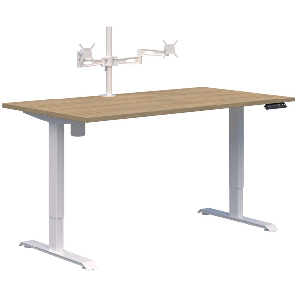 DUO II ELECTRIC DESK W1500 X D800 X H695-1145MM WHITE FRAME CLASSIC OAK WITH METALICON DOUBLE MONITOR ARM WHITE