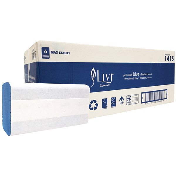 LIVI ESSENTIALS SLIMFOLD PAPER TOWEL 2 PLY 200 SHEET PACK BLUE CARTON 20