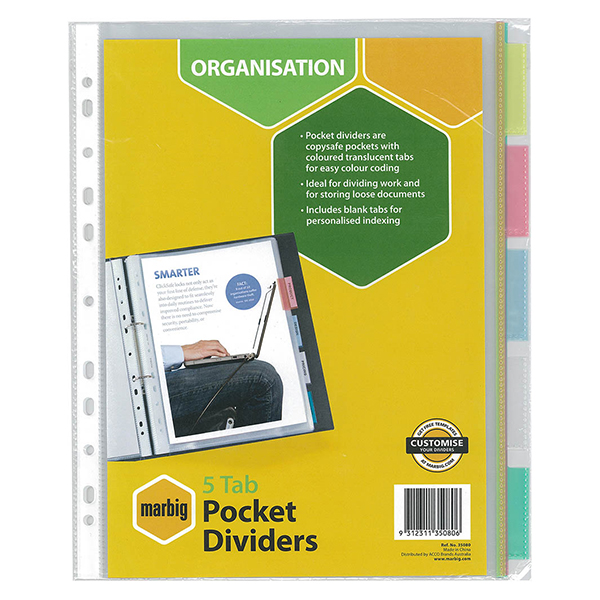 MARBIG COPYSAFE DIVIDER POCKET PP 5-TAB A4 ASSORTED