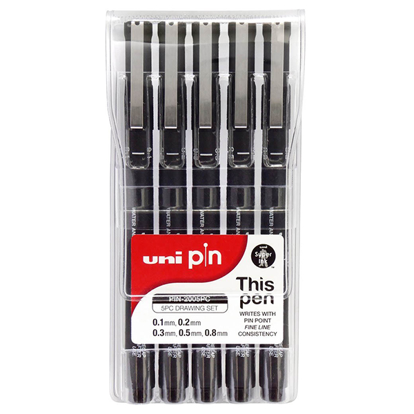 UNI PIN FIBRE TIP PEN 200 PERMANENT 5 PIECE SET 0.1MM-0.8MM BLACK